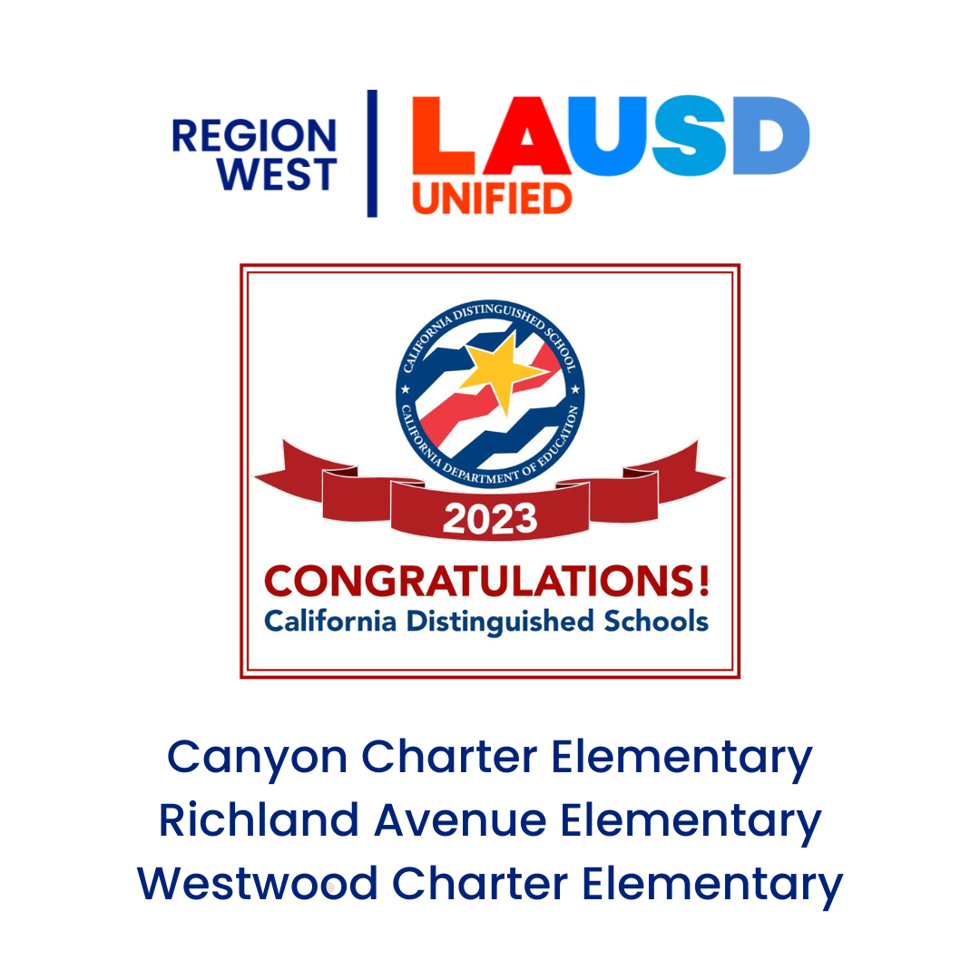 Congratulations Canyon Charter, Richland Ave, and Westwood Charter! Join us in celebrating our 2023 California Distinguished Schools. The prestigious designation is awarded to exceptional schools, teachers, and classified staff for their innovation, talent, and success in supporting students.